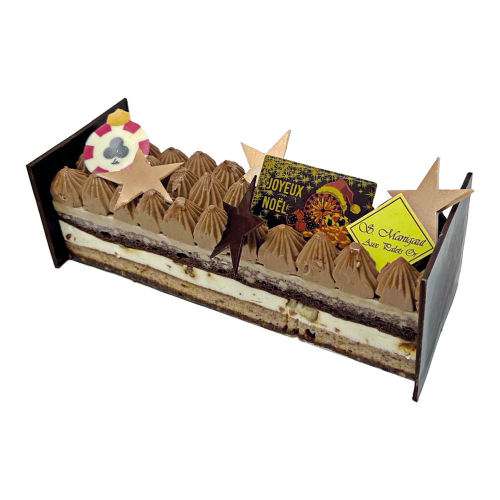 Biscuit financier croustillant à la noix de pécan, ganache montée à la vanille avec éclats de noix de pécan caramélisées, biscuit Sacher, crémeux noix de pécan, surmonté d’une chantilly au chocolat noir.