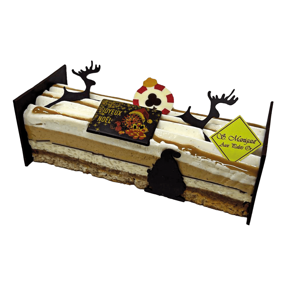 Biscuit macaron noisette, riz au lait à la vanille de Madagascar, petite mousse de noisette et ganache montée vanillée, soulignée d’un soupçon de caramel.
