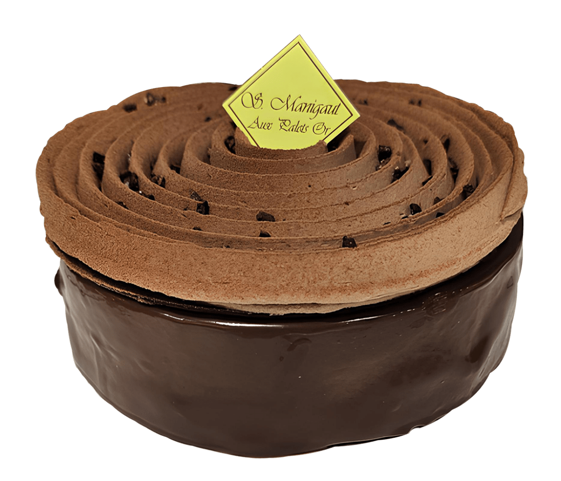 Le tout est surmonté d’une fine feuille de chocolat noir et d’une crème montée au chocolat au lait.